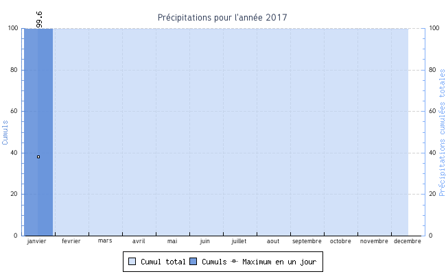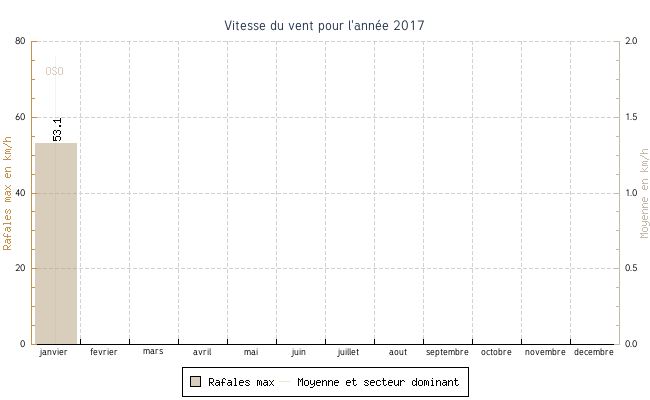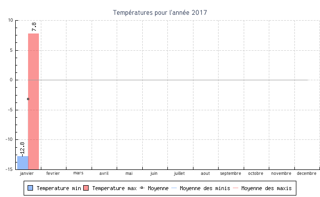 | janvier | -12.8 °C | -6.2 °C | 7.8 °C | 1.3 °C | -3.2 °C | 1.9 km/h | 53.1 km/h | OSO |