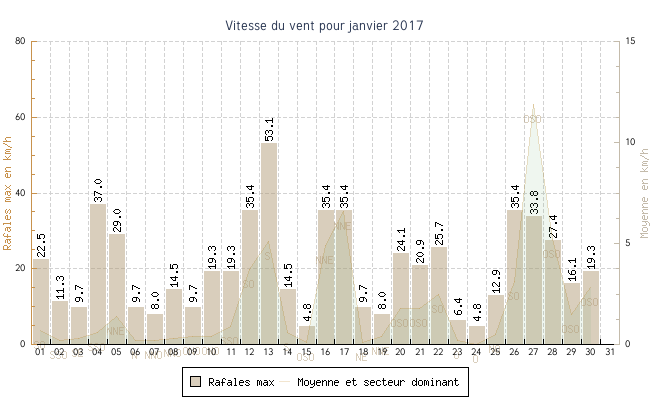 | min | max | moy | Vitesse (rafales) | Secteur | ||